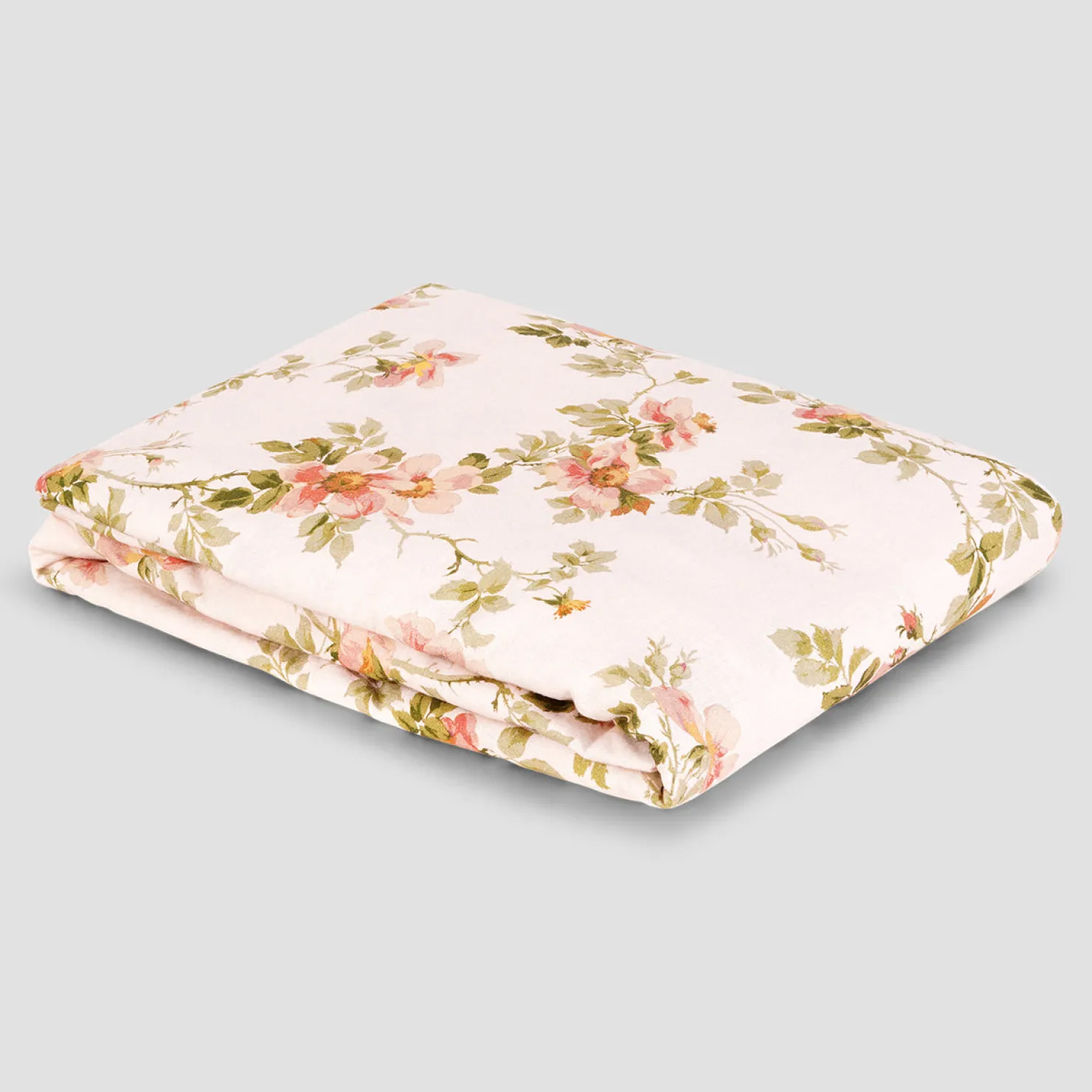 Our Cream Pastel Field Rose linen blend fitted sheet features a delicate printed floral motif of its namesake, inspired by a vintage pattern sourced from the Susanna Samson Design archives. Made from a blend of European linen and cotton, this wonderfully breathable, comfortable and durable fabric offers the best of both worlds. Our fitted sheets have elasticated edges all the way around and fit mattresses up to 16 inches deep.