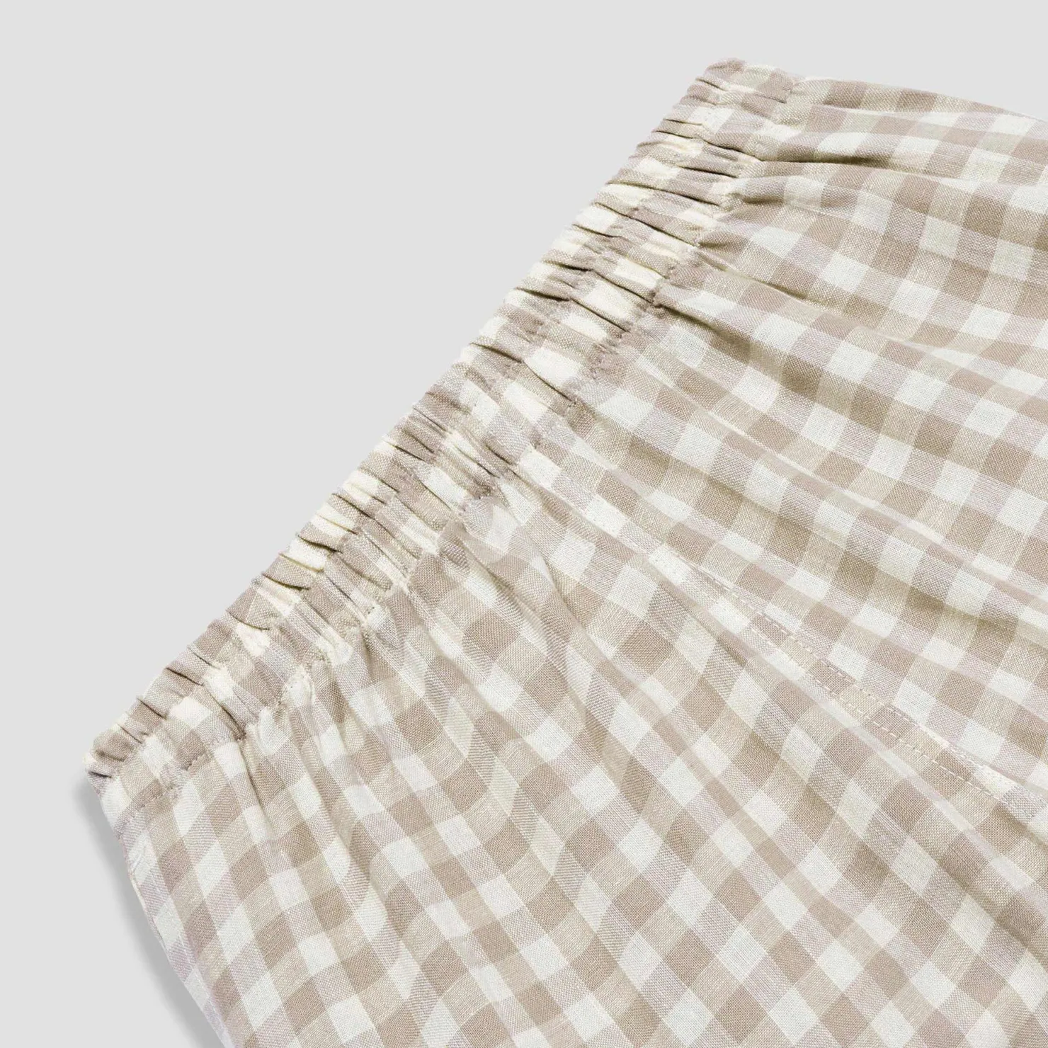 For a blissful night’s kip, snuggle into nostalgic neutrals with our Mushroom Gingham Linen Pajama Shorts, made from super soft 100% stonewashed linen. Made for slow weekend mornings and cozy nights in, our gingham linen sleepwear collection is completely natural and thermo-regulating, keeping you snug during winter and cool throughout the summer. This whimsical print and organic-toned color can be paired with our matching pajama shirt or our plain linen camis to complete the look. Our gingham sleepwear is an oversized, and more relaxed fit than our core range; we recommend sizing down if a more snug fit is desired.