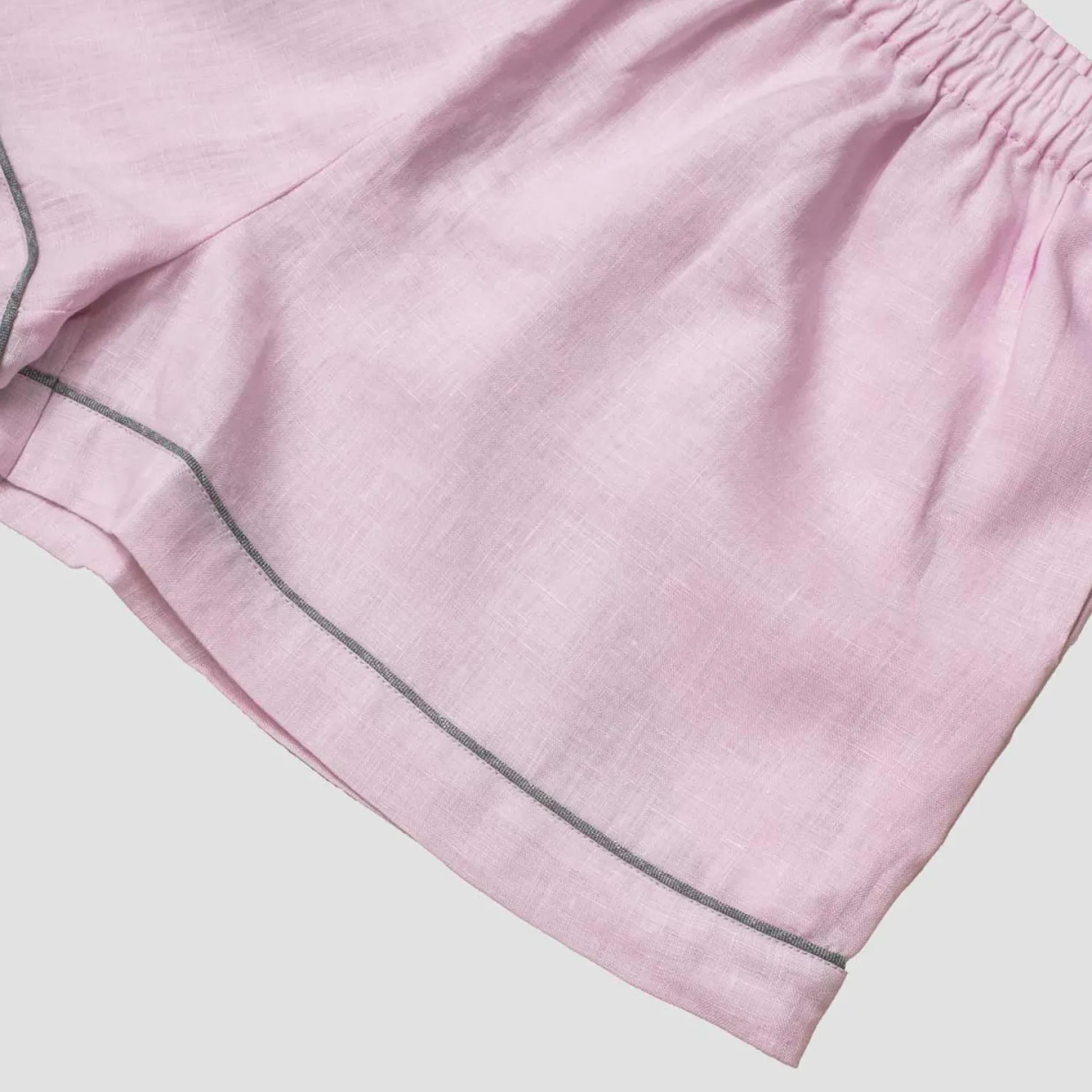 Made for stylish snoozing, our classic Blush Pink pajama shorts are made from super soft 100% stonewashed linen. Linen keeps you cozy and warm in the winter and cool in the summer. This lightweight and effortlessly comfortable set features a relaxed fit linen shirt and pair of linen shorts; perfect for quiet days at home and weekend trips away.