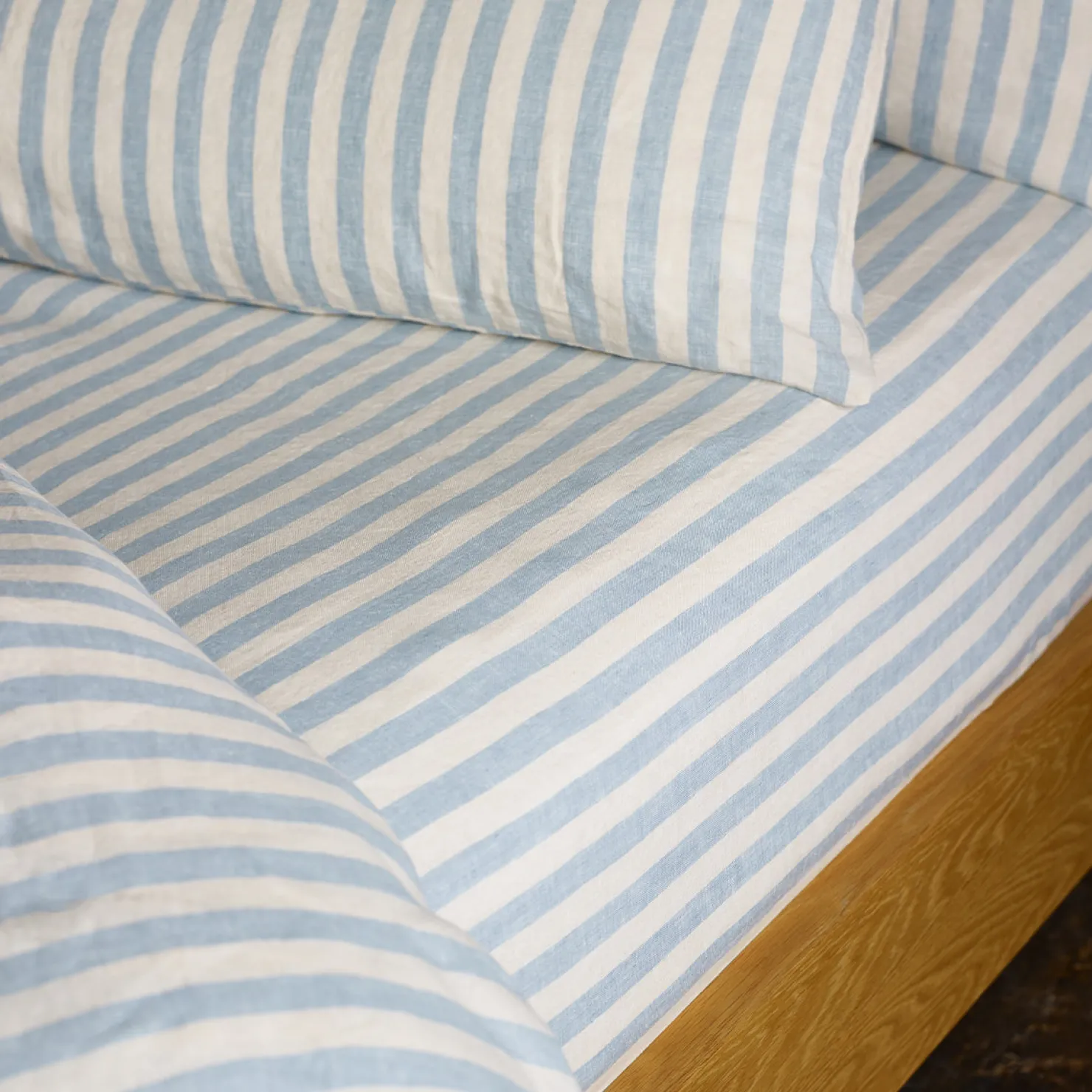 Nestle into nostalgia with our bold deckchair-inspired Coastal Blue Pembroke Stripe linen fitted sheet. Owing to its unique weave, linen is naturally thermoregulating and moisture-wicking, keeping you cool on hot summer nights and cozy in the winter. Our fitted sheets have elasticated edges all the way around and fit mattresses up to 16 inches deep.