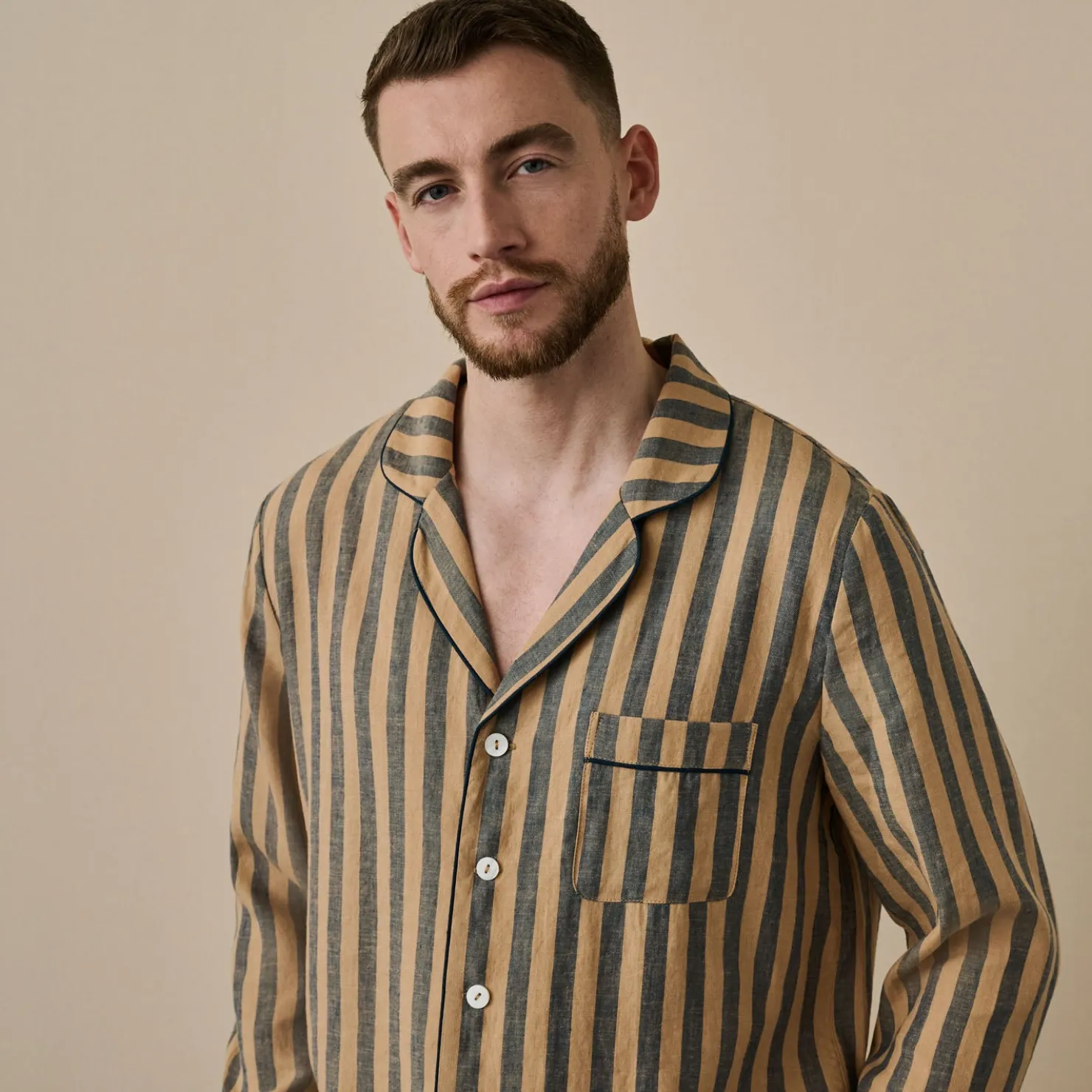 Linen Pajamas>Piglet in Bed Blue Porcini Striped Linen Tencel Men’s Pajama Shirt Blue & Porcini Stripe