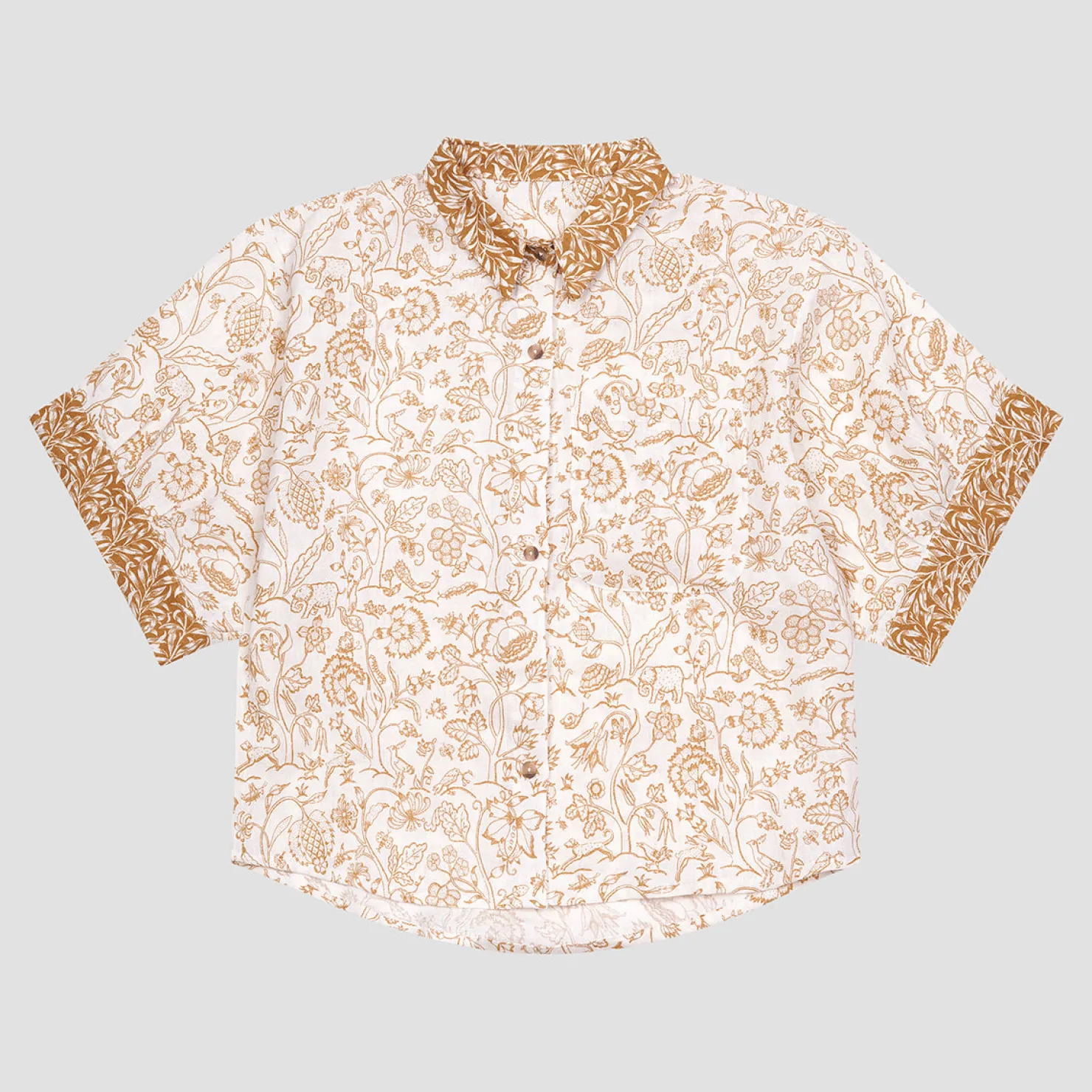 • Recycled paper buttons and a patch pocket on the shirt