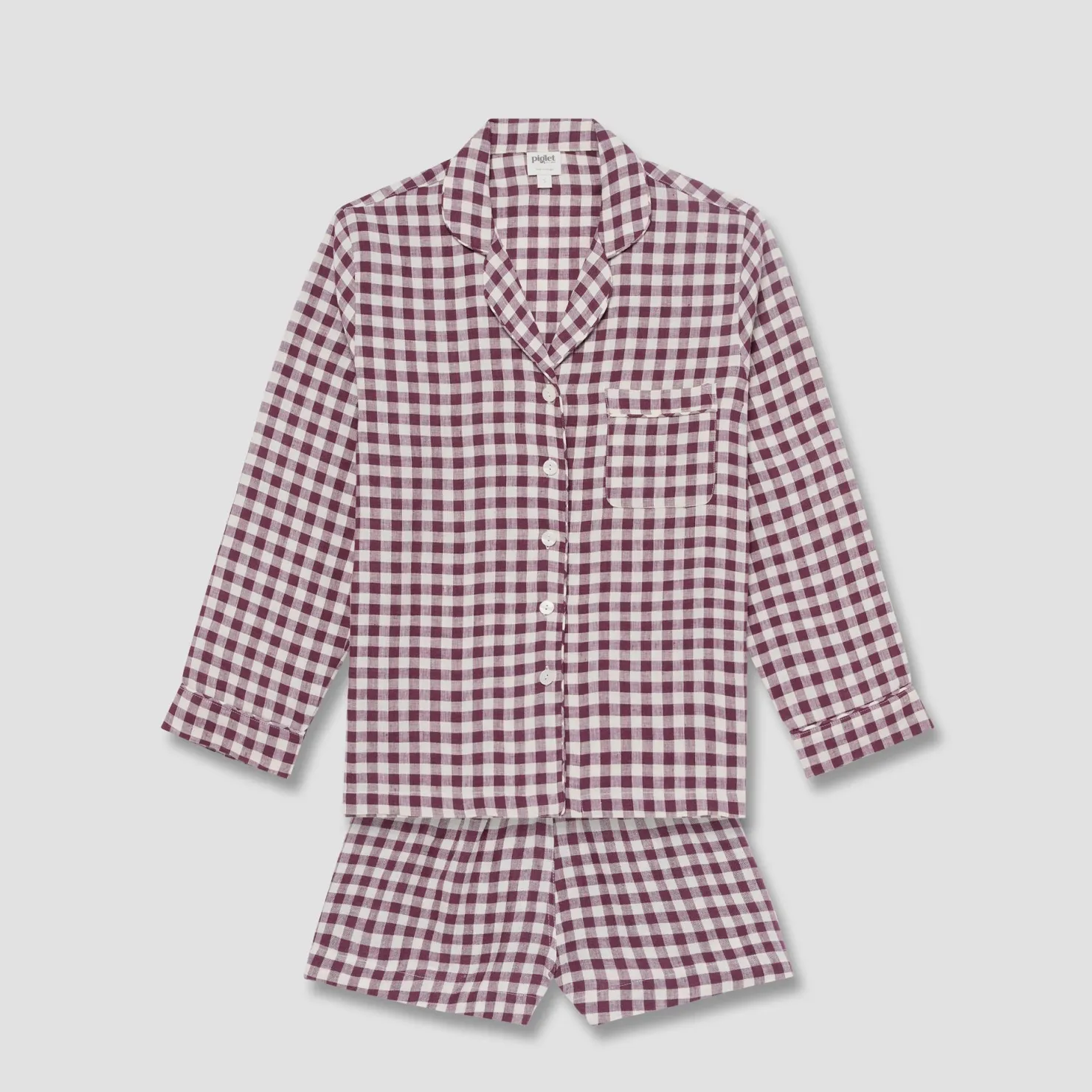 Made for those who want a mixture of cool and cozy, opt for our Gingham Pajama Shorts Set, in whimsical and striking shade – Berry. Made from 100% stonewashed linen, this short set is ideal for all-year-round snoozing and weekend slouching, as linen keeps you cozy and warm in the winter and cool in the summer. Our gingham sleepwear is an oversized, and more relaxed fit than our core range; we recommend sizing down if a more snug fit is desired.