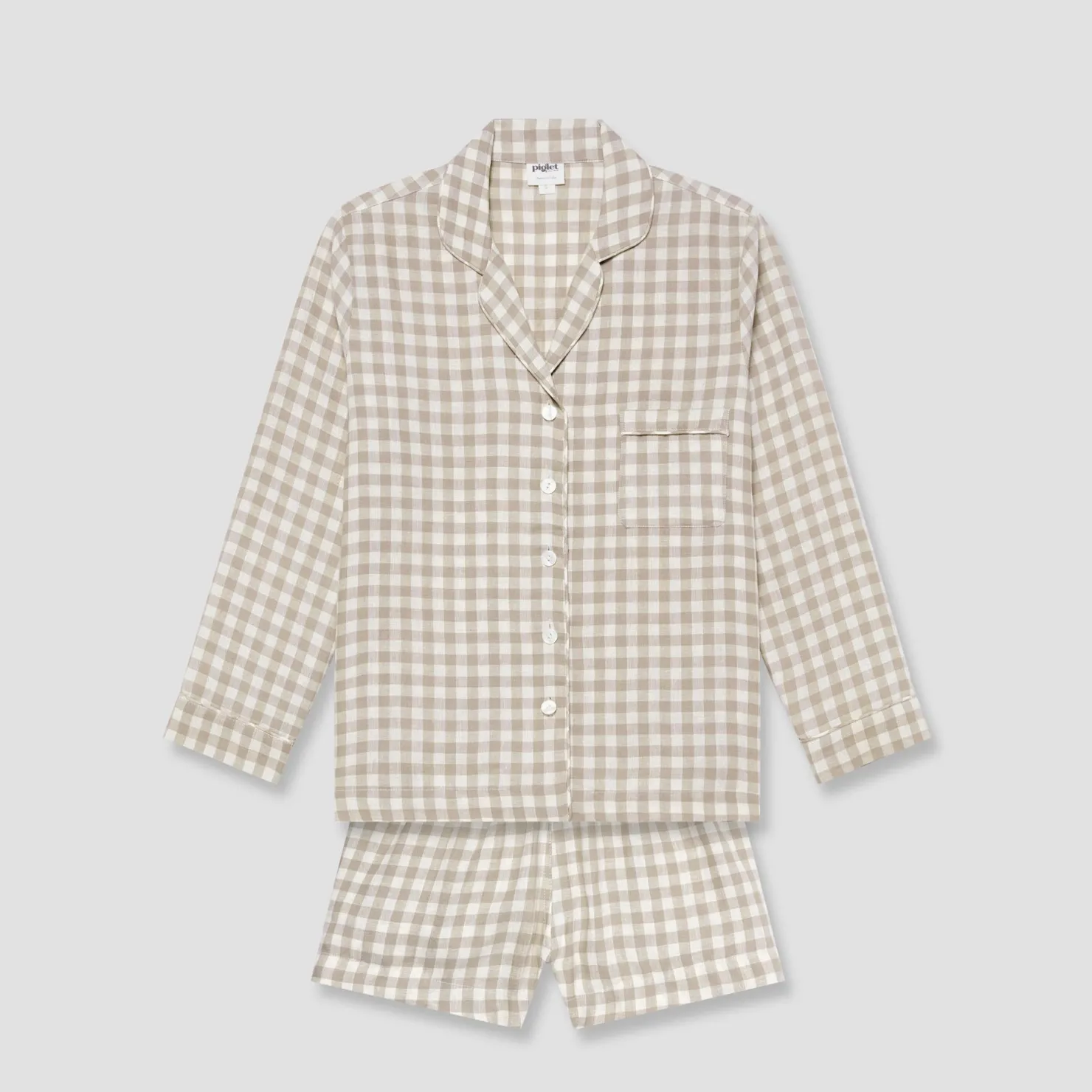 For a Blissful Night’s Kip For a blissful night’s kip, snuggle into nostalgic neutrals with our Mushroom Gingham Linen Pajama Shorts Set, made from super soft 100% stonewashed linen. Made for slow weekend mornings and cozy nights in, our gingham linen sleepwear collection is completely natural and thermo-regulating, keeping you snug during winter and cool throughout the summer. The shirt and short shape is classic, and perfect for those who want a mixture of cool and cozy. Our gingham sleepwear is an oversized, and more relaxed fit than our core range; we recommend sizing down if a more snug fit is desired.