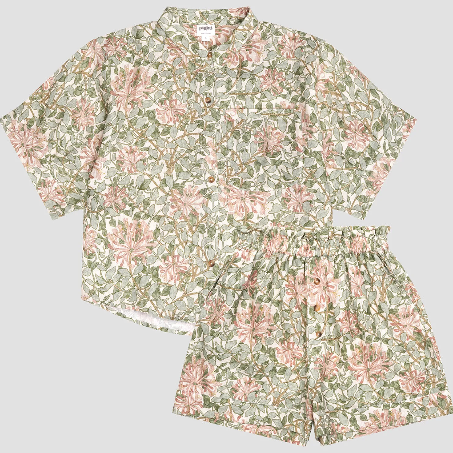 Designed in collaboration with Morris & Co., our Soft Sage linen women’s pajama shorts set features the iconic Honeysuckle pattern created by May Morris in 1883. With its climbing stems and clusters of delicate blooms, the classic motif pays homage to the brand’s rich heritage while faithfully reimagining it for modern living.